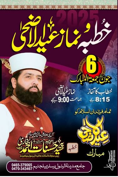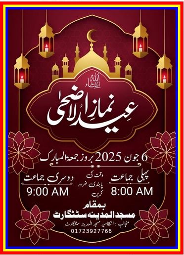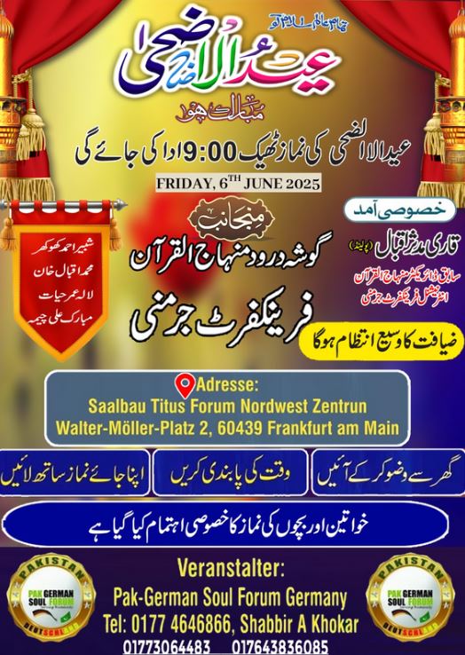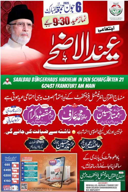 ٭ 6 جون 2025 بروز جمعّہ المبارک پورے یورپ میں عید الاضحی منائی جائے گی جبکہ ہمیشہ کی طرح ادارہ منہاج اجتماعی عید الاضحی کی نماز ہار ہائیم میں ادا کرے گا، فرینکفرٹ اور گرد و نواح کی مساجد کی نماز کے ٹائم ٹیبل بھی آپ شان پاکستان میں دیکھ سکتے ہیں ٭