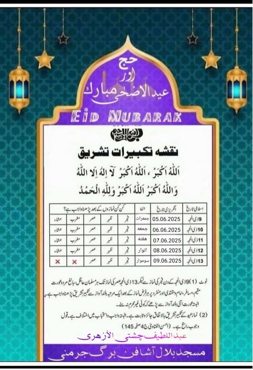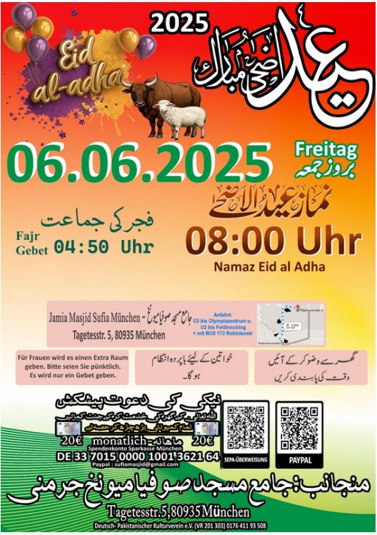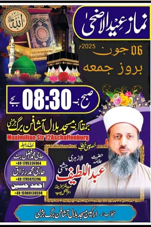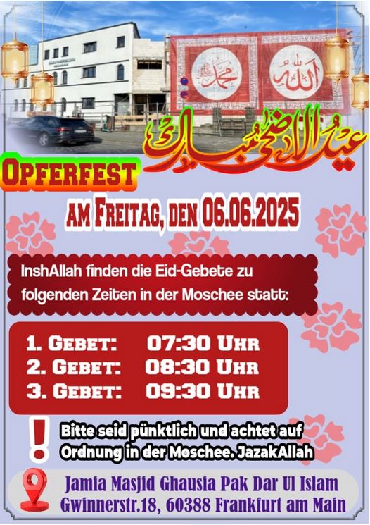 شان پاکستان جرمنی فرینکفرٹ۔ جرمنی میں تقریباََ 6 جون 2025 بروز جمعّہ المبارک عید الاضحی منائی جائے گی۔ جو شیڈول ہم کو موصول ہوئے ہیں ان کی تفصیل درج ذیل ہے۔جرمنی اور یورپ میں کل بروز جمعرات نماز فجر سے تکبیرات شروح ہو جائیں گیں