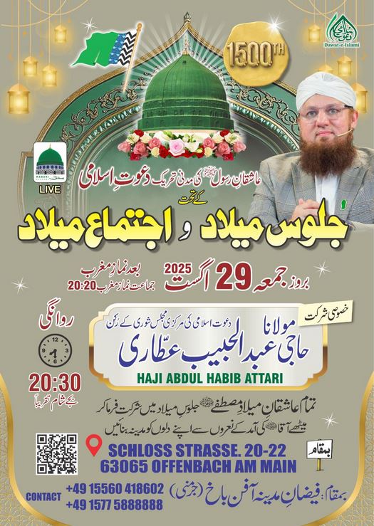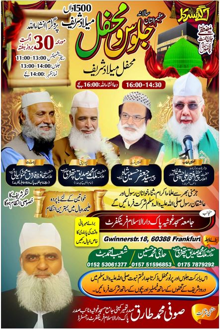 شان پاکستان جرمنی فرینکفرٹ/ریڈر واڈ۔ جلوس میلاد النبی ﷺ، نبی اکرم حضرت محمد ﷺ کی ولادت کا جشن منانے والا تہوار، خوشی کا دن، عید کا دن منایا جاتا ہے جس میں جلوس نکالا جاتا ہے، جسے میلاد النبیﷺ یا میلاد کے نام سے جانا جاتا ہے، اس سالانہ تقریب میں اکثر قرآن پاک کی تلاوت، نشید، نعت، صلوات،دعائیں اور تسبیحات نبی اکرم حضرت محمدﷺ کی تعریف میں اور نبی اکرم ﷺ سے محبت اور شکر گزاری کا اظہار کرنے والی تقاریر شامل ہوتی ہیں۔ اسی سلسلے کو مد نظر رکھتے ہوئے۔جامع مسجد غوثیہ۔پاک دارالسلام گونر اسٹریٹ میں بروز ہفتہ بتاریخ 30 اگست 1500ویں عظیم الشان سالانہ جلوس و محفل میلاد شریف کا اہتمام کیا جا رہا ہے، جلوس میں شامل ہونے والوں کے لئے صبح (11:00 سے 13:00 بجے تک۔ریفریشمنٹ (ناشتہ) کا اہتمام کیا جائے گا جبکہ 13:00 بجے سے 14:00 بجے تک جلوس قریبی شاہراہ سے گزرتے ہوئے جامع مسجد غوثیہ تک آئے گا، نماز ظہر کے بعد محفل میلاد کا اہتمام کیا جائے گا جو کہ 16:00 بجے تک جاری رہے گی بعد ازں اجتماعی دُعا کی جائے گی، پھر لنگر محمدی پیش کیا جائے گا)جبکہ عاشقان رسولﷺ کی مدنی تحریک دعوتِ اسلامی کے تحت جلوس میلاد و اجتماع میلاد بروز جمعہ 29 اگست کو بعد نماز مغرب منعقد کیا جائے گا جس میں مولانا حاجی عبد الحبیب عطاری خصوصی شرکت فرمائیں گے،جلوس کی روانگی ساڑھے آٹھ بجے شام کو ہو گی٭
