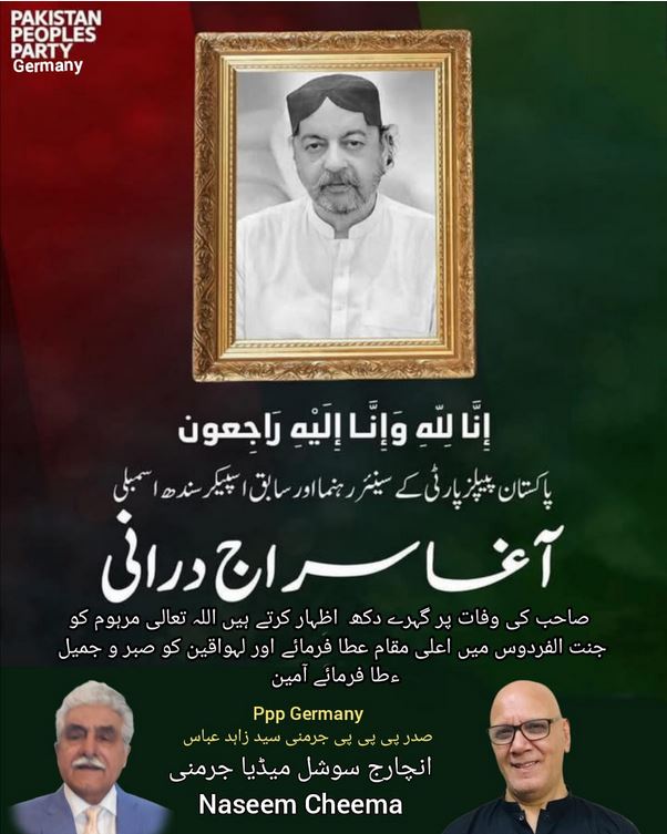 ۔،۔مرکزی رہنماء اور سابق اسپیکر سندھ اسمبلی آغا سراج درانی کی وفات پر پیپلز پارٹی جرمنی گہرے رنج و غم میں۔ نذر حسین۔،۔