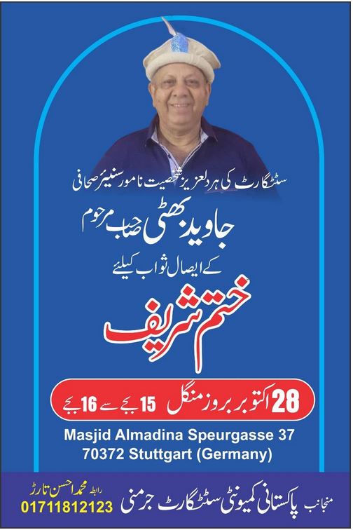شان پاکستان جرمنی فرینکفرٹ/سٹٹگارٹ۔ پاکستانی کمیونٹی سٹٹگارٹ کی طرف سے جاوید اقبال بھٹی کے ایصال ثواب کے لئے 28 اکتوبر بروز منگل بوقت 15:00 سے 16:00 بجے تک ختم شریف کا اہتمام کیا گیا ہے جس میں شرکت کر کے ثواب دارین حاصل کریں۔ جاوید اقبال بھٹی کسی تعارف کے محتاج نہیں، وہ کاروباری۔ مذہبی۔ سماجی اور سیاسی حلقوں میں بھی ایک حیثیت رکھتے تھے خصوصی طور پر آپ کا نام ایک نامورصحافی کے طور پر جاناجاتا تھا، ہر وقت ہنستے مسکراتے چہرے کے ساتھ ہر محفل کی رونق بنتے تھے، ان کے صبر کی بھی انتہا تھی، ہر کسی کے دکھ درد میں بھی شریک رہتے،اپنی طرف سے جتنی بھی مدد کی جا سکتی وہ کرتے تھے۔ایڈریس۔