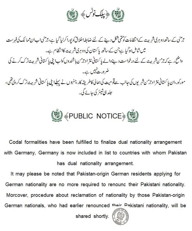 ٭سفارتخانہ اسلامی جمہوریہ پاکستان برلن کی سرکاری پوسٹ پر یہ نوٹس دیکھا جا سکتا ہے، جس پر تقریباََ آٹھ سال کی جدوجہد شامل ہے بالآخر۔جرمنی کے ساتھ دوہری شہریت کے انتظامات کو حتمی شکل دینے کے لئے ضابطہ اخلاق کو پورا کر لیا گیا ہے،جرمنی اب ان ممالک کی فہرست میں شامل ہو گیا ہے جن کے ساتھ پاکستان کی دوہری شہریت کا انتظام ہے٭