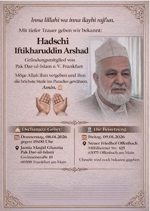 ٭حاجی افتخارالدین ارشد قضائے الہی سے وفات پا چکے ہیں، ان کی نماز جنازہ بروز جمعرات بوقت (سات بجے۔19:00 uhr) جامع مسجد غوثیہ۔پاک دارالسلام گوِنَر اٹراسے 18 ریڈروالڈ ادا کی جائے گی٭