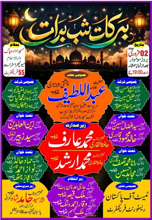 ٭شبِ برات کی نورانی محفل میں خصوصی خطاب سرپرست اعلی پاسبان ختم نبوت جرمنی حضرت علامہ عبد اللطیف چشتی الازہری فرمائیں گے،جبکہ نعت خواں حضرات کی بھی بھرپور شرکت ہو گی٭